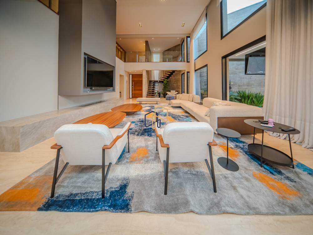 Sala ampla integrada, pé-direito duplo, lareira em mármore Taj Mahal